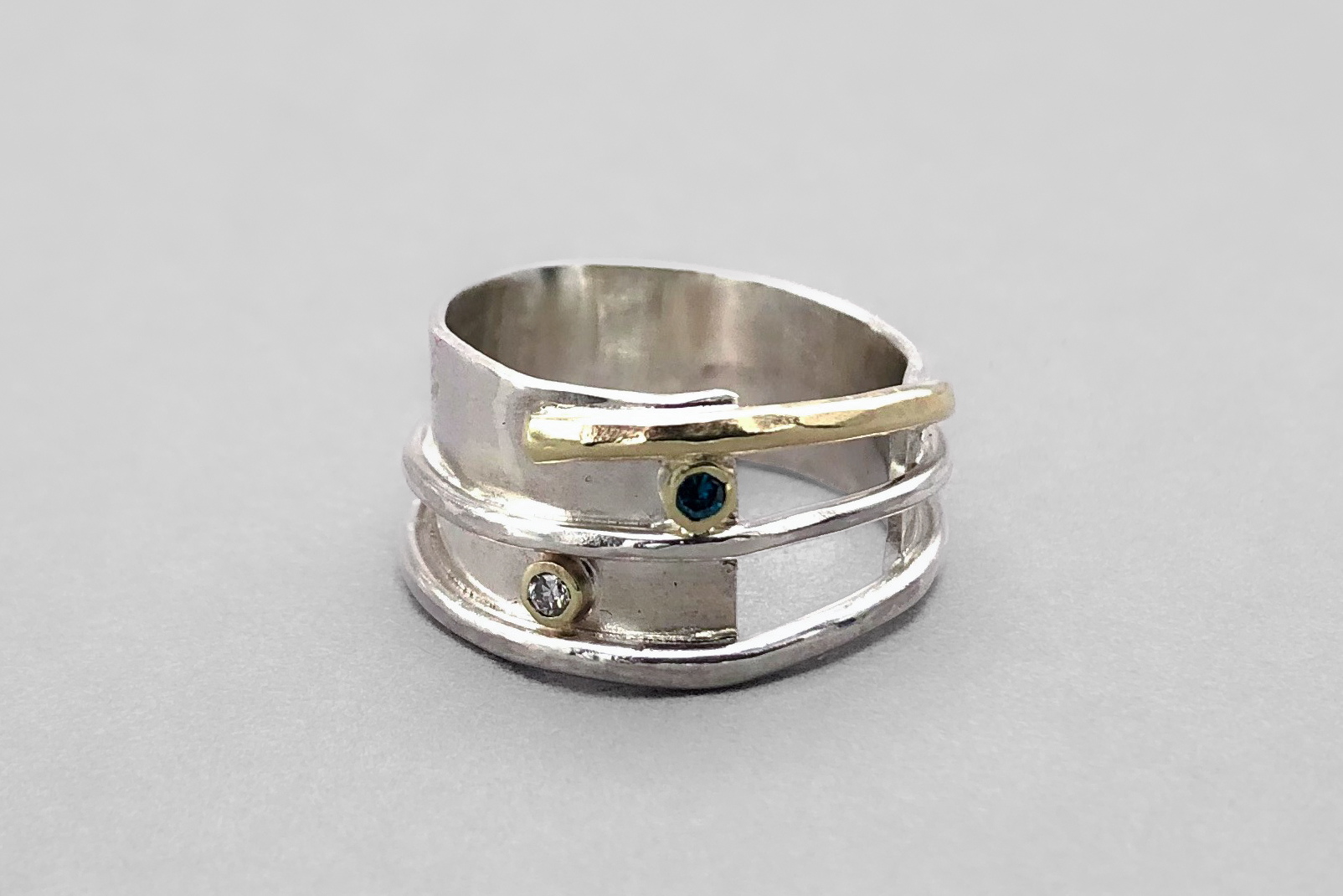 Silber Ring mit 9ct Gelbgold Strang und 2pt weissem und blauem Diamant.