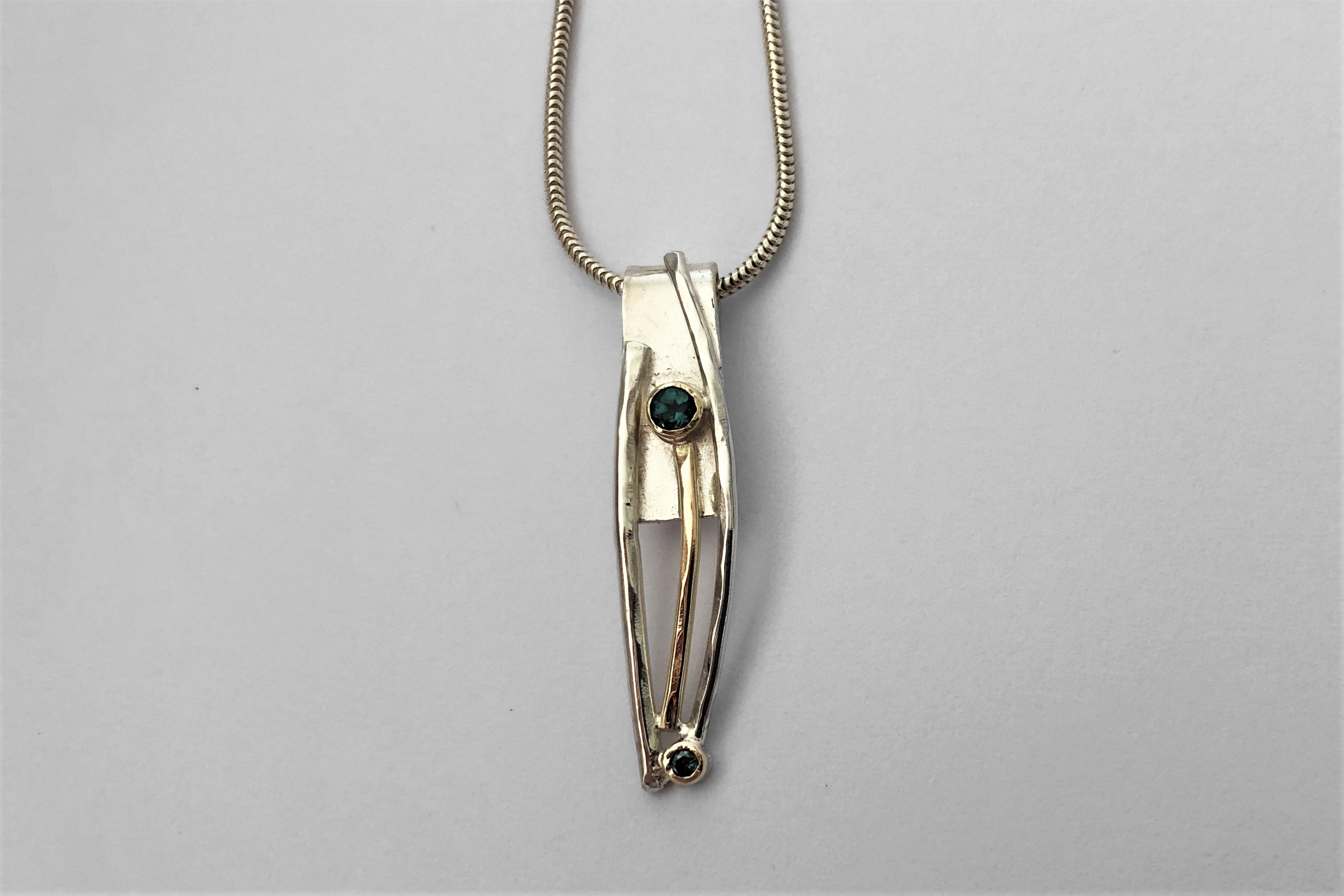 Silver pendant 4cm with 9ct yellow gold strand and 3+2mm blue tourmaline on snake chain.