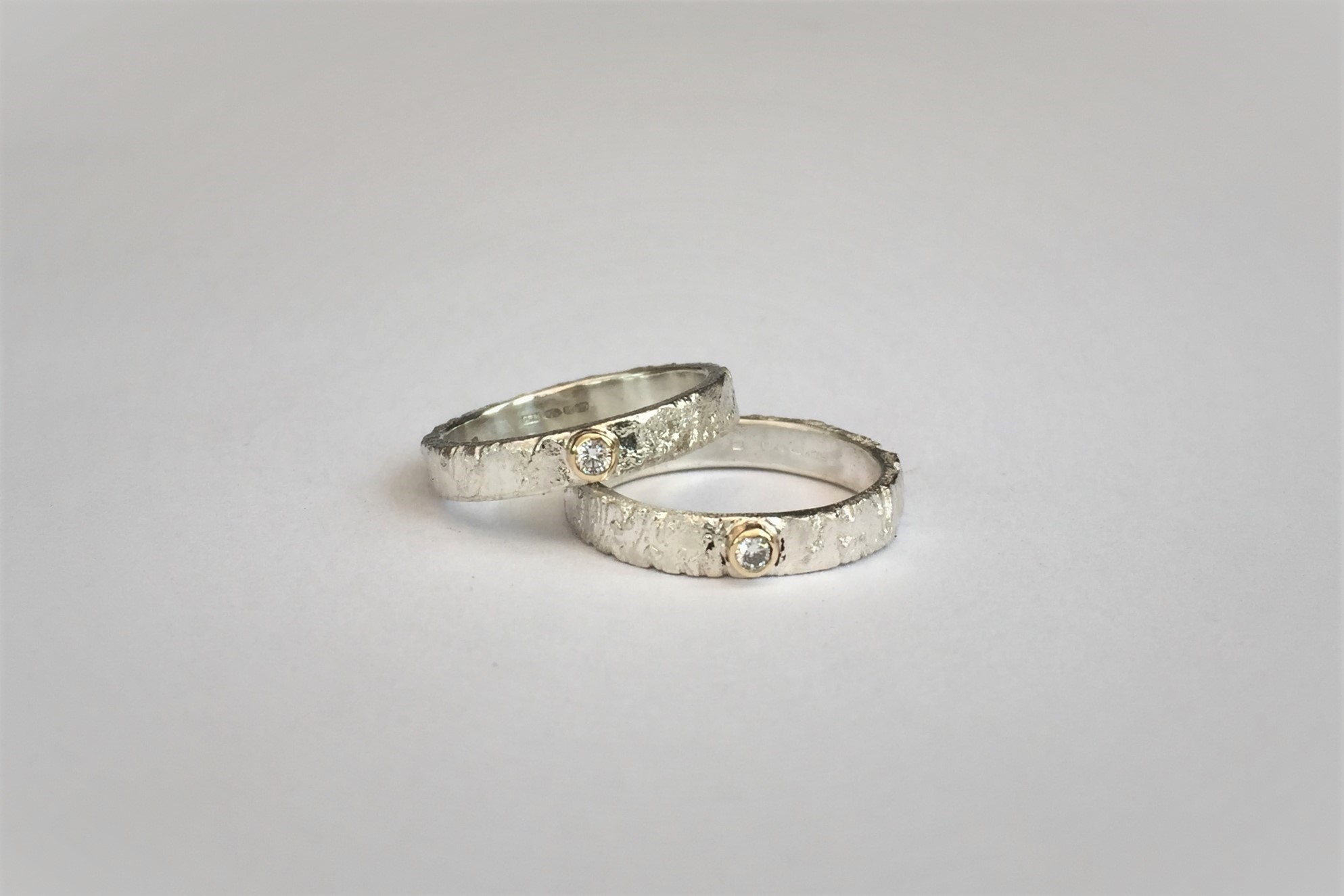 3 mm textured silver ring, 9ct gold setting with 3pt diamond.